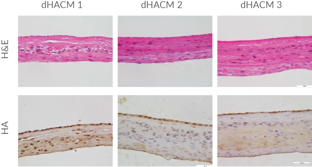 Histological assessment with immunohistochemistry for hematoxylin and eosin. hyaluronic acid. Each stain shows a representative image taken with a 20x objective for each donor.1