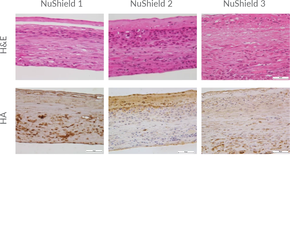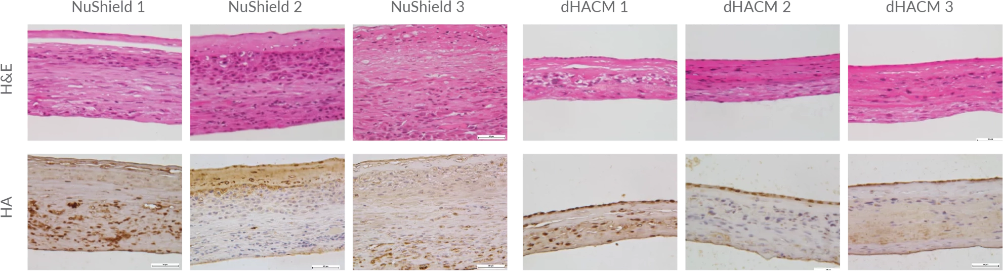 Note: * indicates significance where P<0.05In this evaluation, HA levels were significantly higher in NuShield to support use as a protective barrier than in another commercially available dHACM, with an average of 3.25 μg/cm2 HA in NuShield compared to 0.52 μg/cm2 HA in the other commercially available dHACM.1